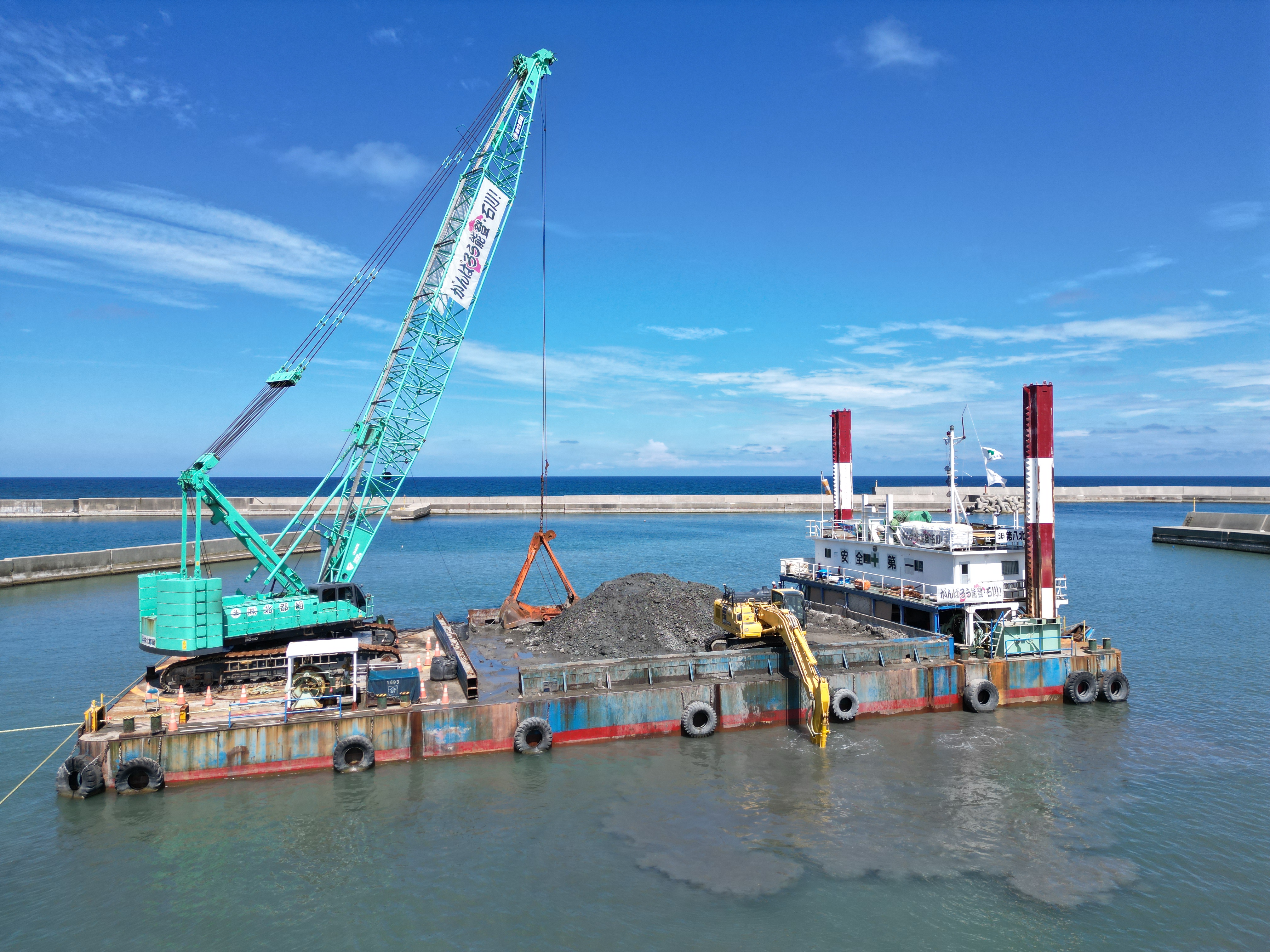 ◆石川県内では数少ない、140トン吊りの大型クレーン付き台船を