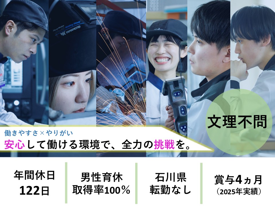 | 開催概要 | 【日 程】要相談(10:00~15:00) 【持ち物】筆記用具(※昼食は当社で用意いたします。) 【服 装】ス―ツ 【場 所】石川県能美市大浜町ヤ25(能美根上駅から徒歩9分) ※建物が2か所にありますが、能美市立病院の隣で行います。 【連絡先】0761-55-0600(会社代表番号) 【内 容】会社説明、工場見学、座談会、各部署訪問(予定) |