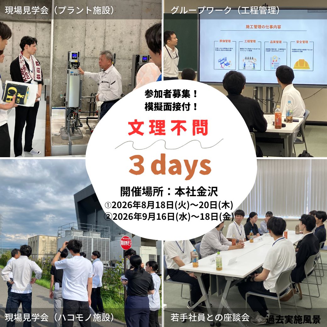 | 開催概要 | ■3days 仕事体験プログラム内容 10:00~17:00を予定しております(昼食休憩1時間) ★1日目: ・オリエンテーション ・会社概要説明 ・業界研究 ・若手社員との座談会 ★2日目 ・実習:現場見学&こだわり発見ワーク (どの現場かは当日のお楽しみ!ハコモノ、プラント現場へ行きます!) 現場ではどんなことをしているのか、実際に肌で感じてみましょう! ★3日目 ・施工管理での仕事における課題発見・解決ワーク(グループワーク)(例)学祭に置き換えて工程管理をしてみよう! ・適性テストをもとに自己分析 ・模擬面接体験 └面接のプロからのレクチャー&フィードバックあり! |